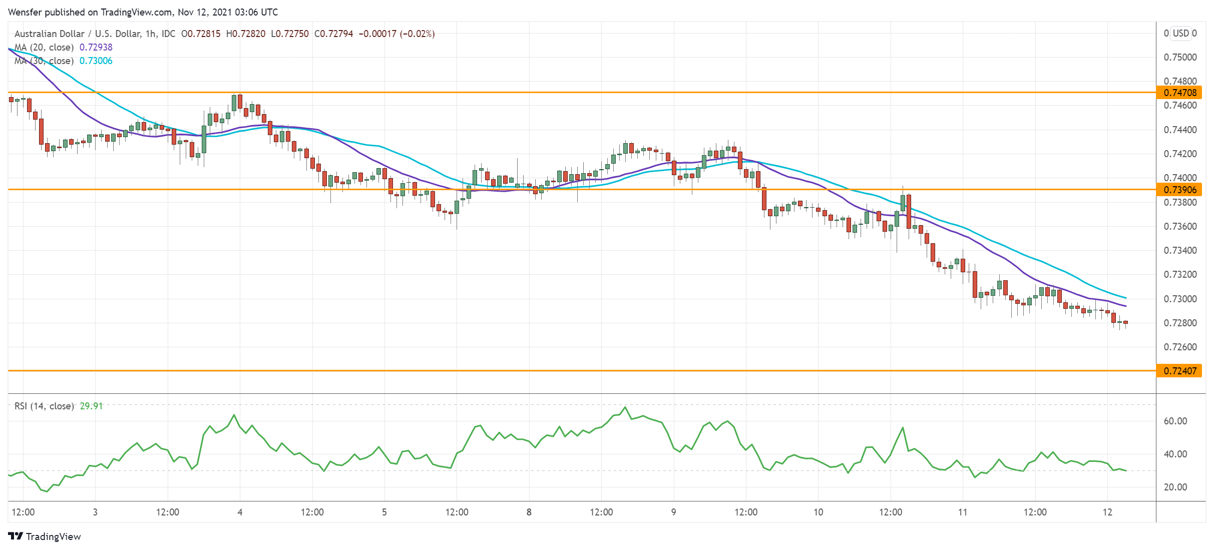 The base of October’s bullish breakout at 0.7240 is the next support. The RSI’s oversold situation may cause a limited rebound from the round number at 0.7300, though it is likely to turn out to be a dead cat bounce.