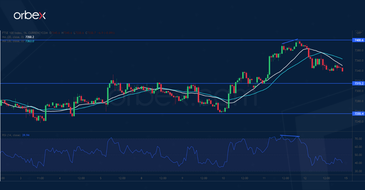 The index came under pressure at the psychological level of 7400. A combination of an overbought RSI and its bearish divergence suggests that the rally was losing momentum. Sentiment remains upbeat and a pullback could be an opportunity to get filled at a better price.