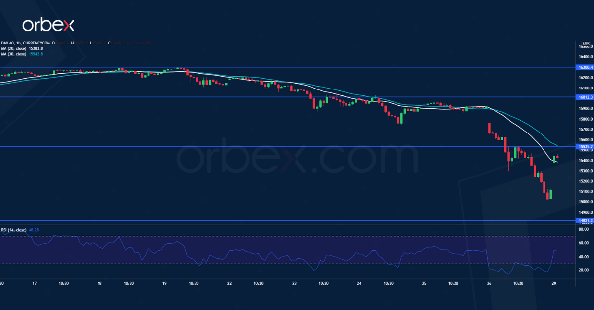 The momentum is typical of a catalyst-driven sell-off. Below 15150 the index is testing the psychological level of 15000. The RSI’s oversold situation has attracted a ‘buying-the-dips’ crowd in the demand zone.