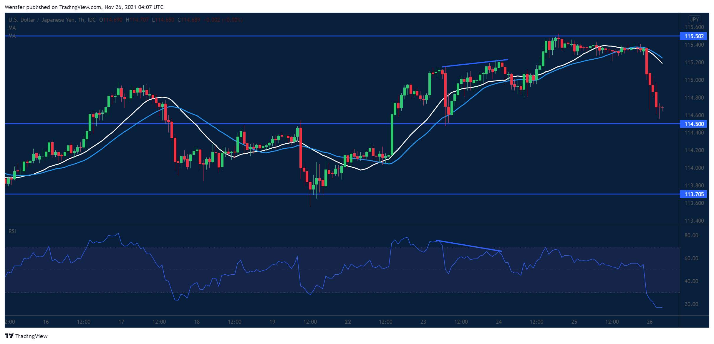 A break below 114.90 confirmed weakness in the rally and prompted buyers to close their bets. As the RSI dips into the oversold territory, 114.50 is the immediate support where buying interest could be expected.