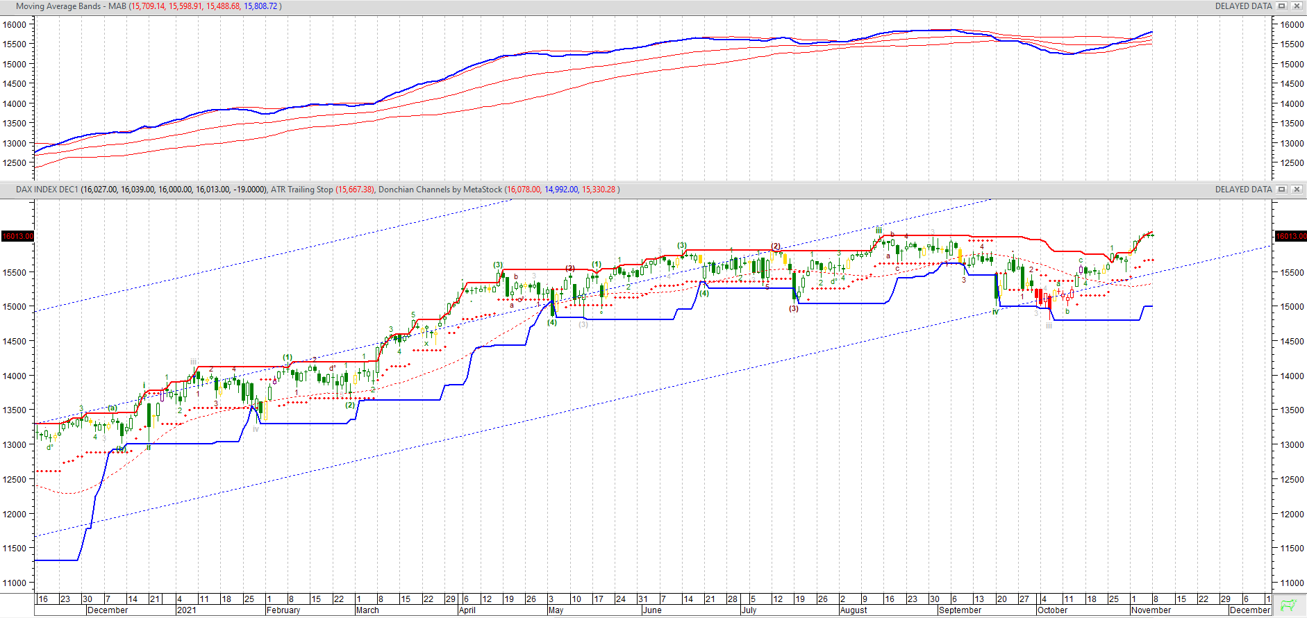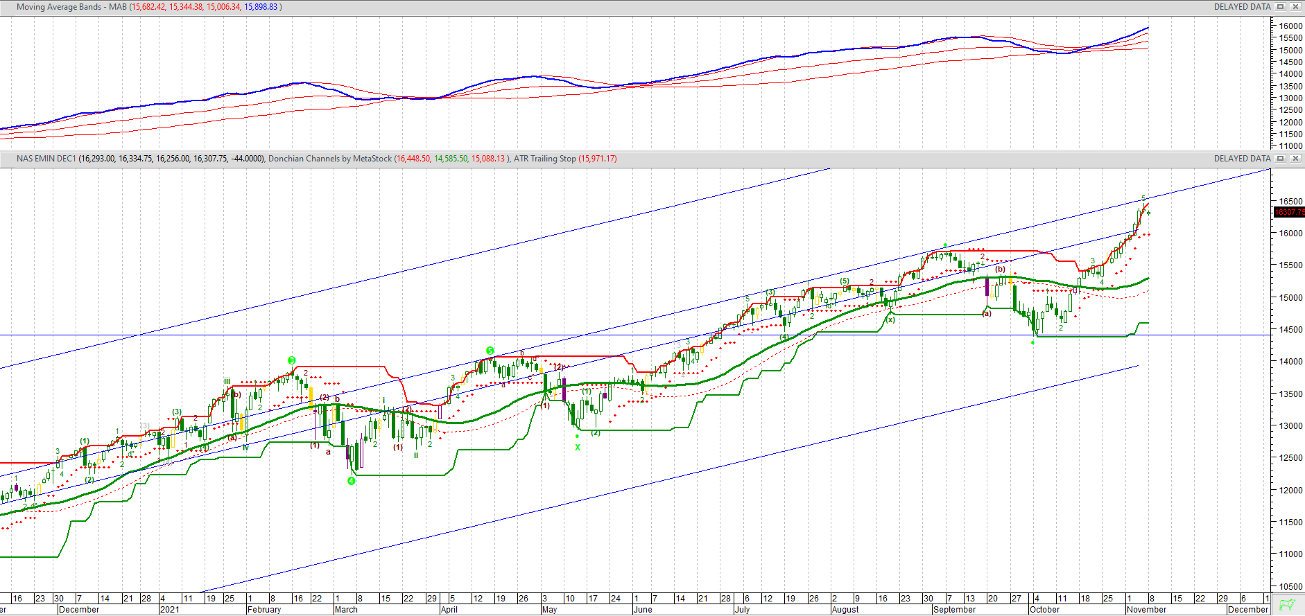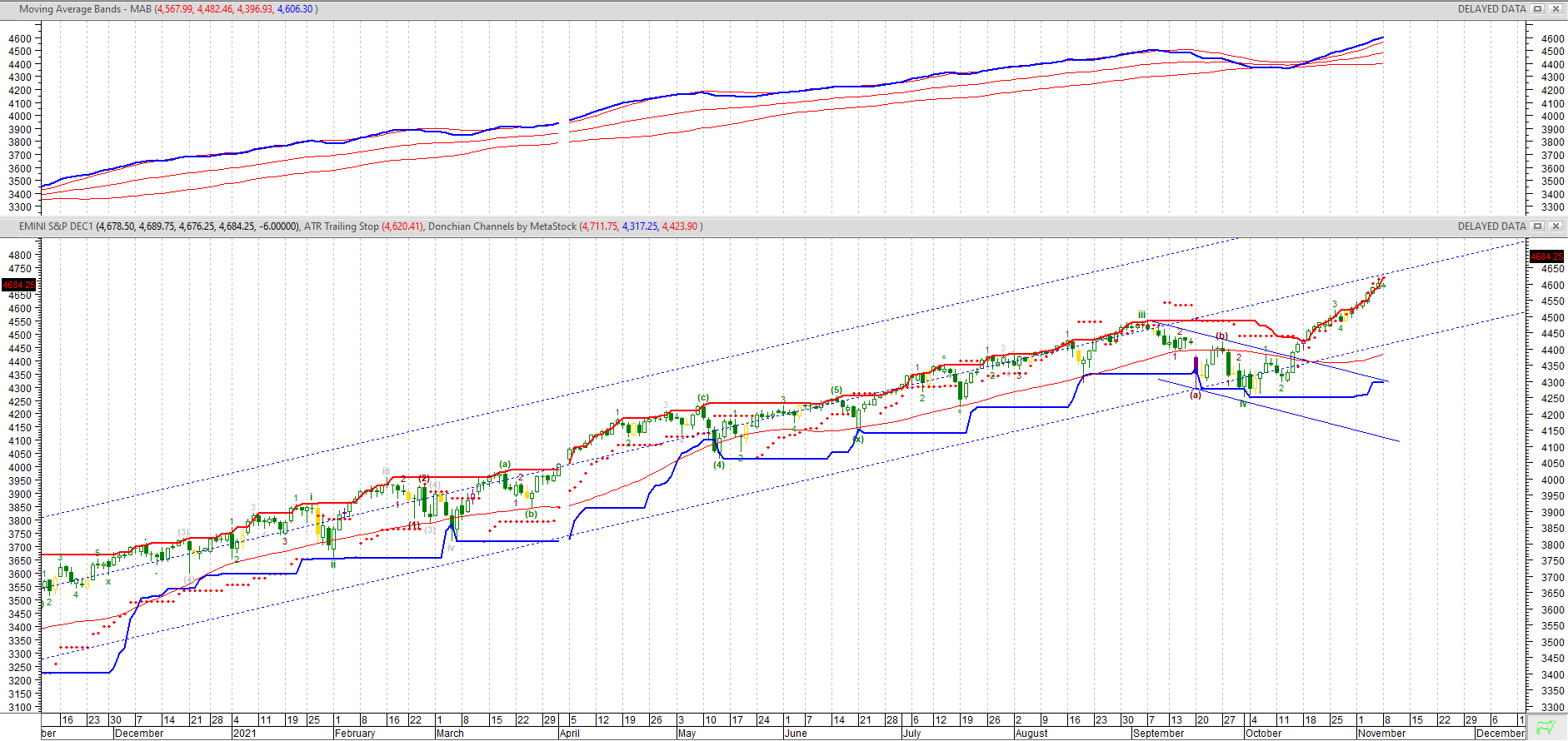 I futures sull’indice S&P 500 hanno chiuso la settimana con un nuovo rialzo, superando di slancio quota 4,600 e segnando nuovi massimi storici a ridosso di quota 4,700, per il combinati disposto delle ottime trimestrali e per la comunicativa assunta dalla FED per tranquillizzare i mercati. Facciamo notare che il rialzo in corso ha subito una frenata a ridosso della regressione in atto dai minimi del 2020 e che lo stesso conclude la quinta settimana di ascesa continua, la più lunga serie settimanale di guadagni da aprile. Con oltre 300 società nell’S&P 500 che hanno riportato risultati positivi, l’82,1% ha superato le aspettative di utili, con tasso di crescita degli stessi su base annua che, per il terzo trimestre, si attesta al 39,2%. La tendenza rialzista è stata quindi confermata, con gli acquirenti che hanno spinto con grande forza sopra 4,600. Il supporto di contenimento resta sempre fissato a 4,335, ma già chiusure sotto 4,543 potrebbe decretare un innesco correttivo più profondo del precedente.