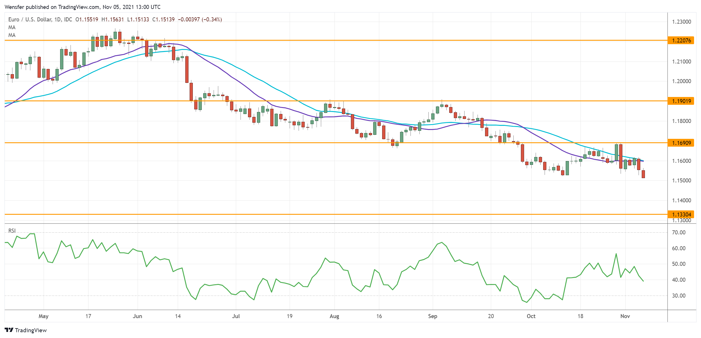 The Fed has its focus on boosting job growth, making October’s solid job gains a bullish argument. The euro has met resistance at 1.1690. 1.1330 would be the next target as the downtrend resumes.