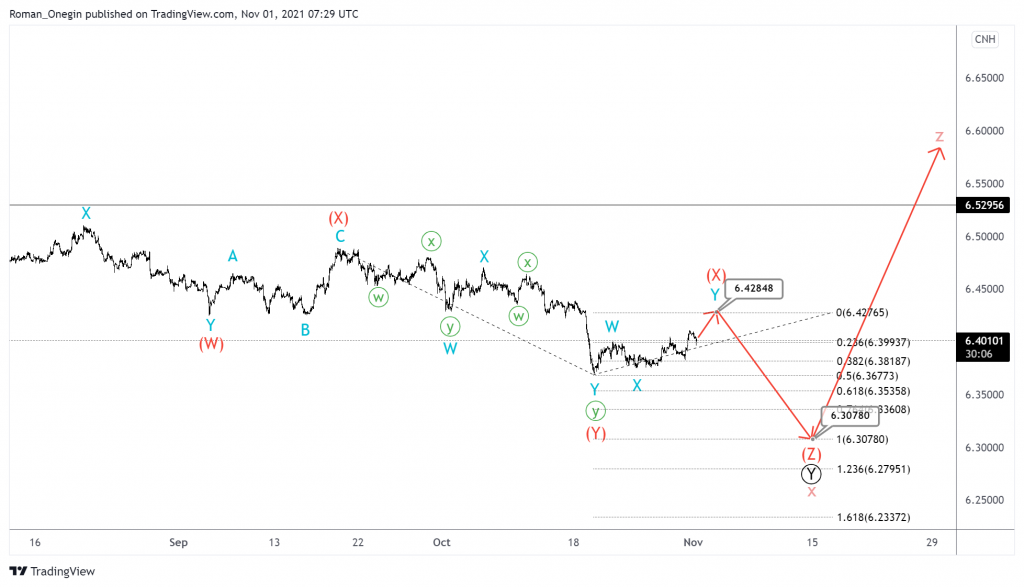 The formation of the USDCNH currency pair suggests the development of a large intervening wave x of a cycle degree. It assumes a primary double zigzag Ⓦ-Ⓧ-Ⓨ. And the final primary wave Ⓨ is currently under construction.