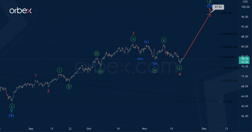 Thus, in the near future, we could see a correction decline of the market in the minor double zigzag W-X-Y as shown in the chart near 69.38. At that level, wave (4) will be at 38.2% of impulse wave (3).