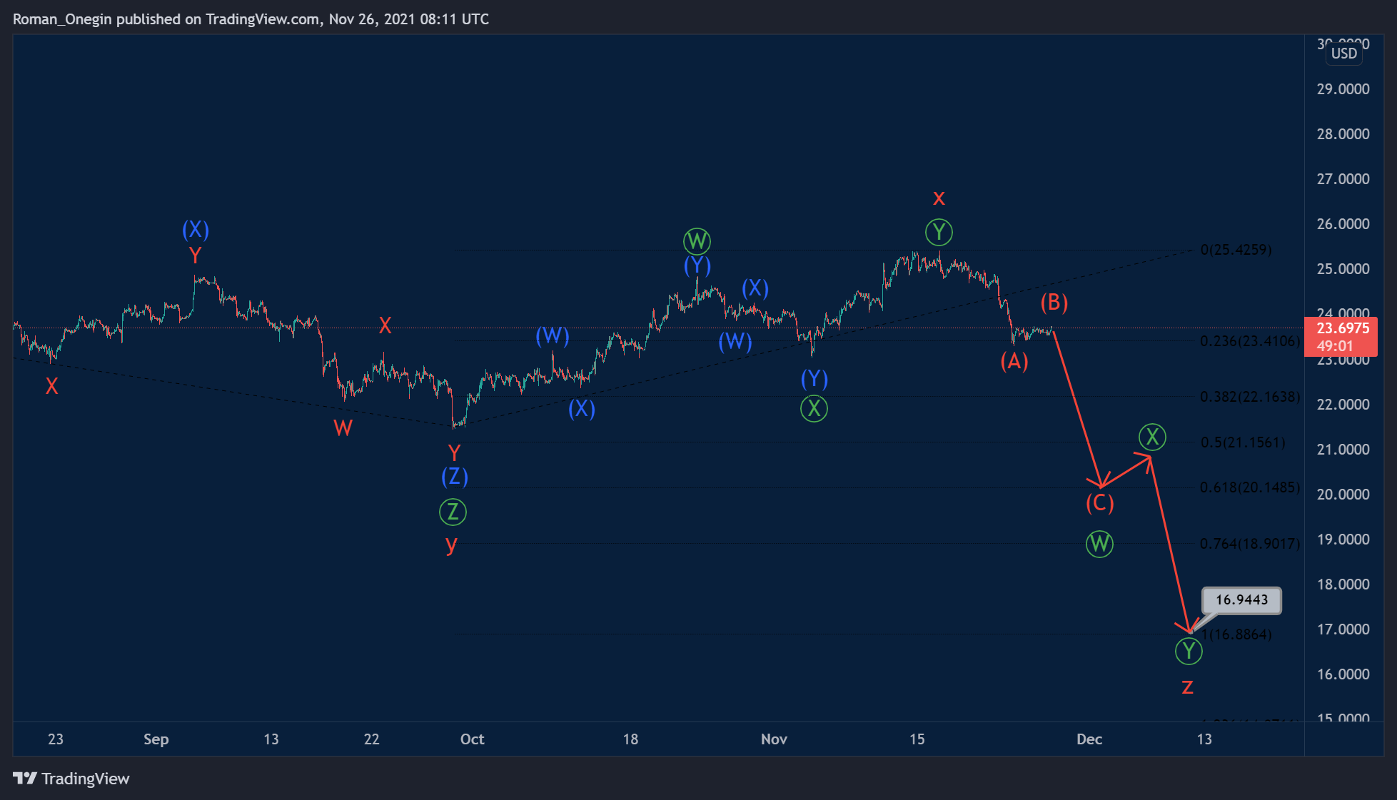 Most likely, the wave Ⓨ will be an intermediate double combination (W)-(X)-(Y) and will complete its pattern near 26.814. At that level, cycle degree wave x will be at 61.8% of wave y.