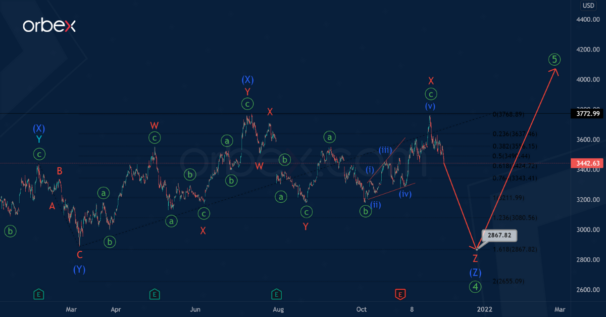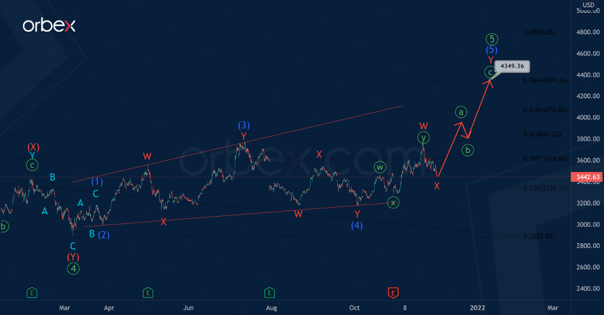 Then bulls could enter the market and push the price in the primary fifth wave above the level of 3772.99, marked by an intermediate intervening (X), as shown on the chart.