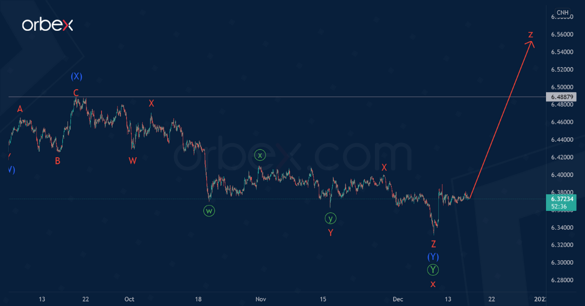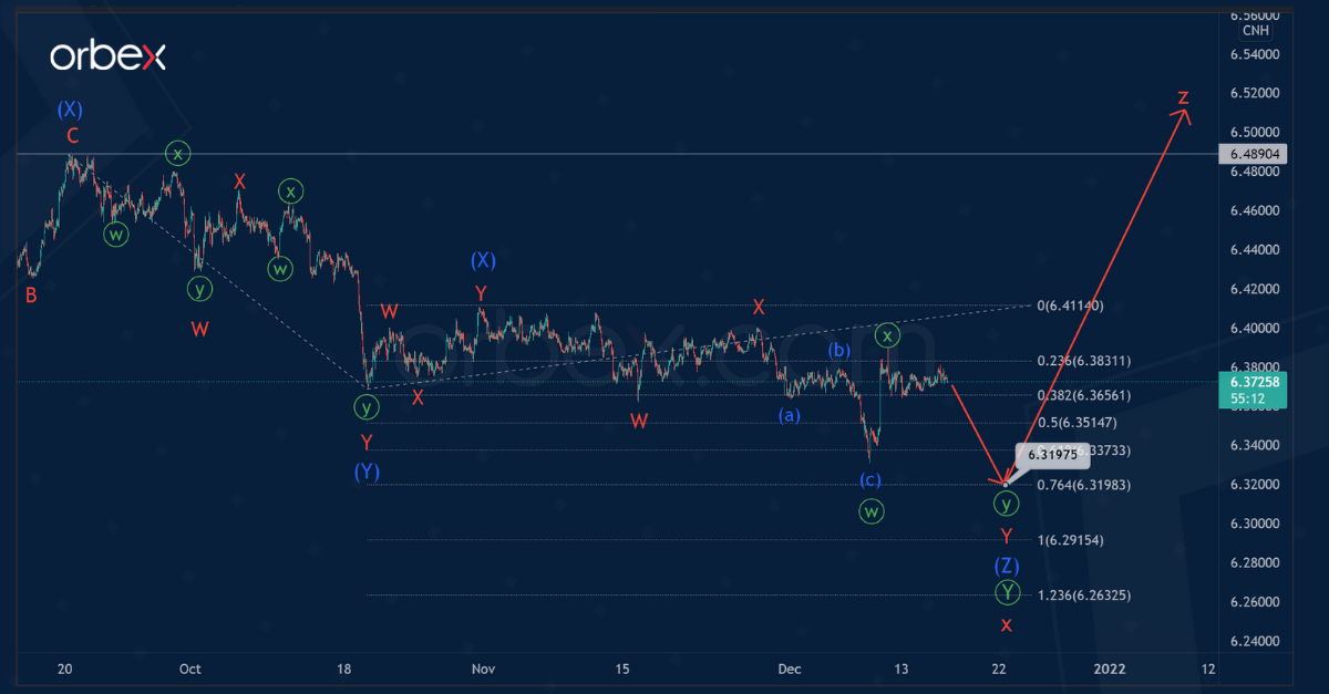 The current structure of the USDCNH currency pair suggests the development of a large intervening wave x of the cycle degree. It is a primary double zigzag Ⓦ-Ⓧ-Ⓨ. The final primary wave Ⓨ is currently under construction.
