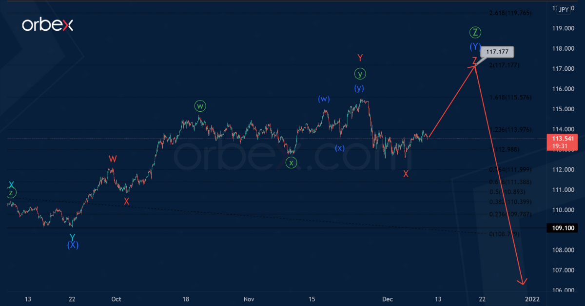 In the current structure of USDJPY a large triple zigzag consisting of primary sub-waves Ⓦ-Ⓧ-Ⓨ-Ⓧ-Ⓩ is developing.