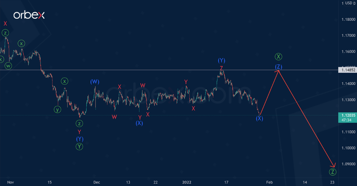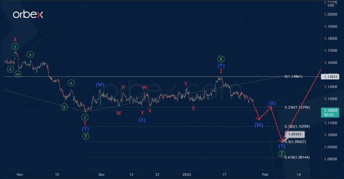 The current structure of the EURUSD pair suggests the construction of a downward correction pattern. This takes the form of a triple Ⓦ-Ⓧ-Ⓨ-Ⓧ-Ⓩ zigzag of the primary degree.