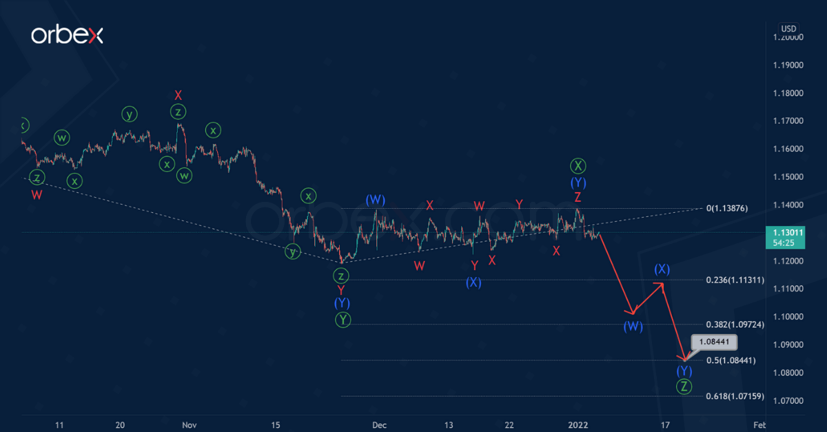 The current EURUSD structure suggests the construction of a downward correction pattern. This takes the form of a triple zigzag of the primary degree, consisting of sub-waves Ⓦ-Ⓧ-Ⓨ-Ⓧ-Ⓩ.