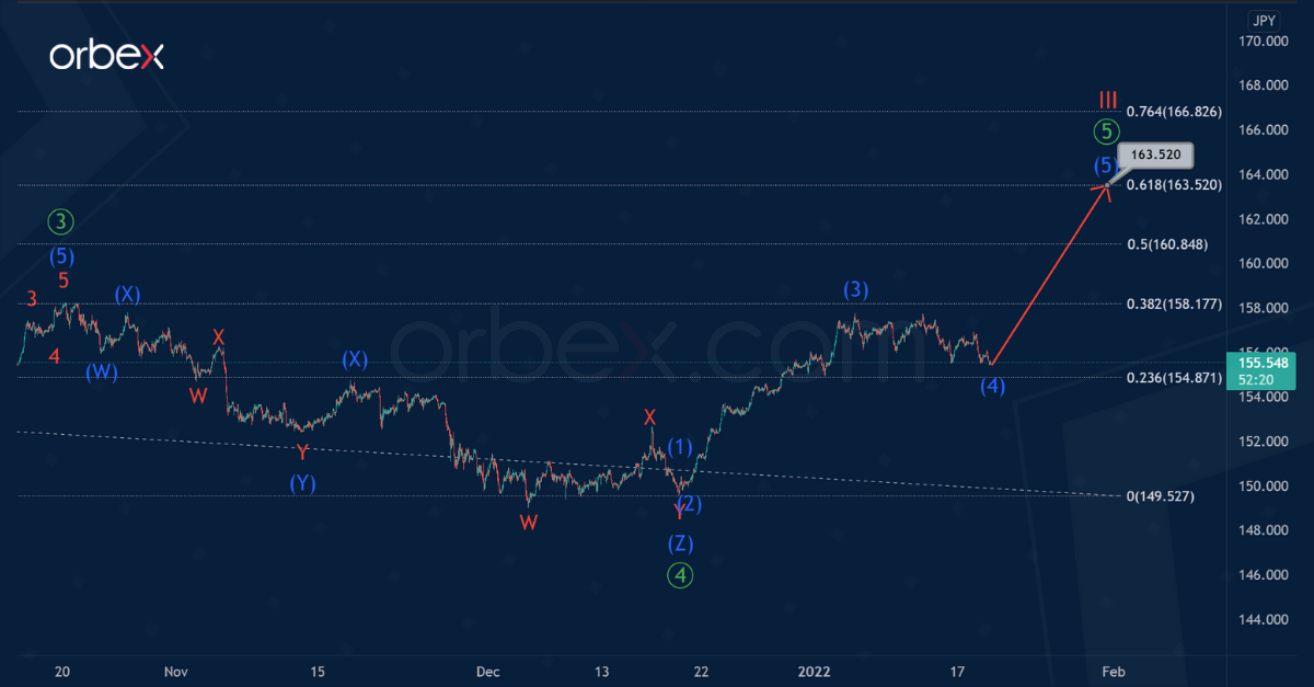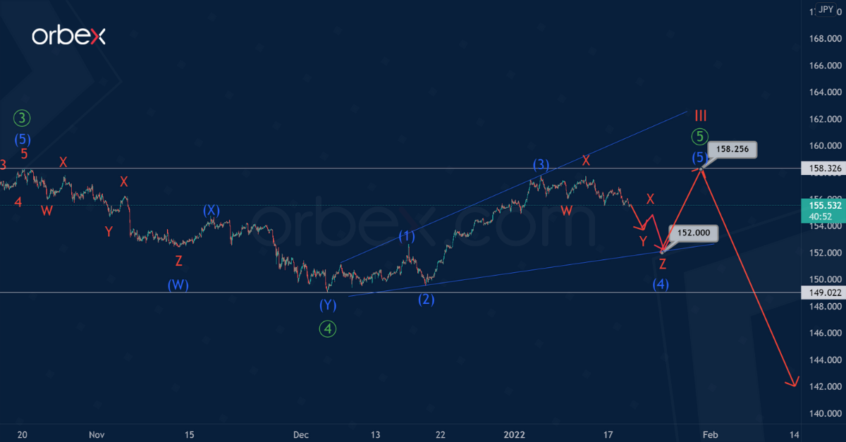 Perhaps wave (4) will be a triple W-X-Y-X-Z zigzag of the minor degree, as shown in the chart. In the near future, prices could lower in the minor sub-waves Y-X-Z to the level of 152.00.