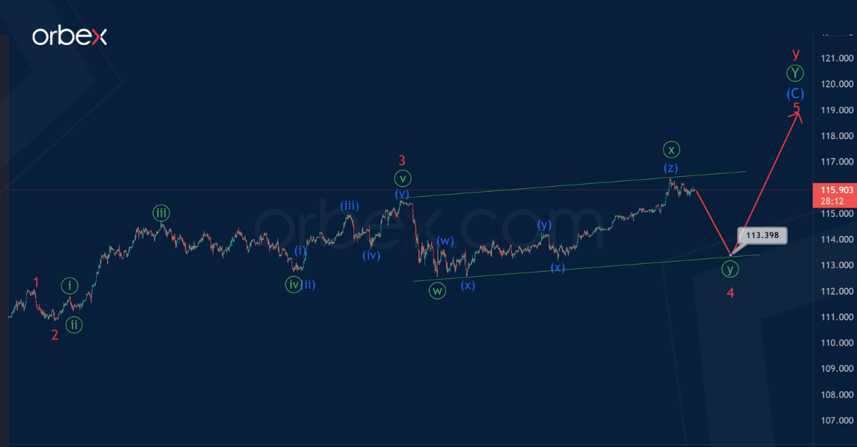 Perhaps in the near future, we will observe a price drop in the minute actionary wave ⓨ. Most likely, the market could fall to the level of 113.39 and then bounce to complete the bullish minor wave 5.