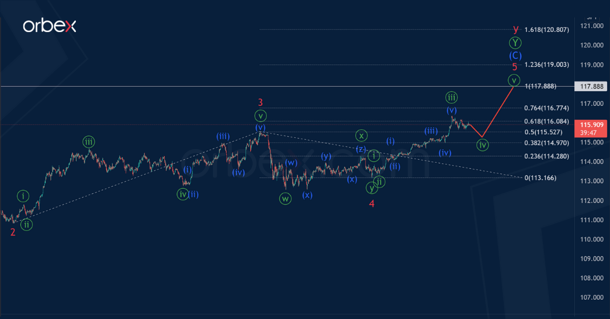 The end of the minor impulse 5 is likely around the level of 117.88, at which minor impulses 3 and 5 will be equal.