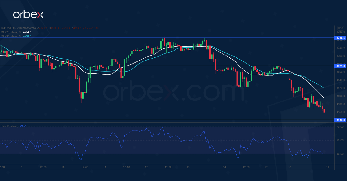The S&P 500 extended losses over rising rate worries. The fall below 4640 invalidates the latest rebound and indicates that sentiment is still downbeat.