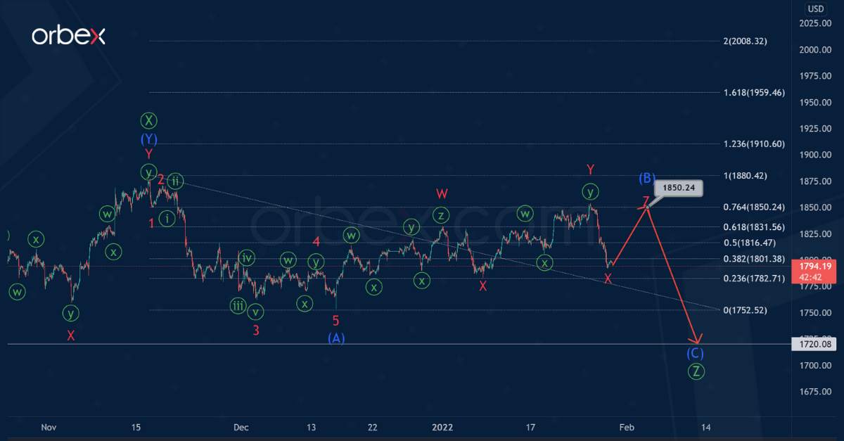 Most likely, the price will rise to the level of 1850.24, where the correction (B) will be at 76.4% of impulse (A).