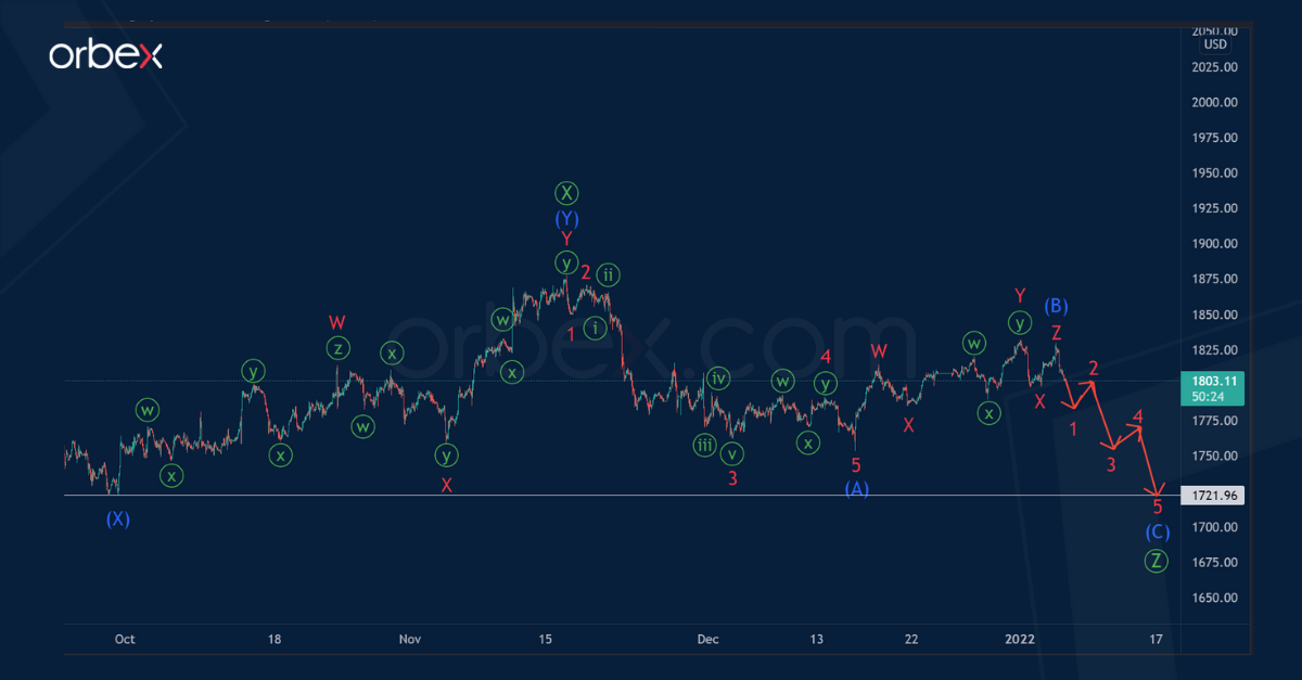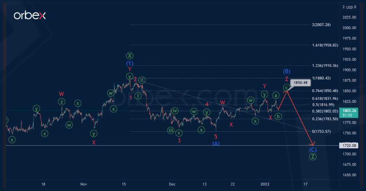 It is likely that gold is moving within the major correction trend, which takes the form of a triple zigzag Ⓦ-Ⓧ-Ⓨ-Ⓧ-Ⓩ of the primary degree.