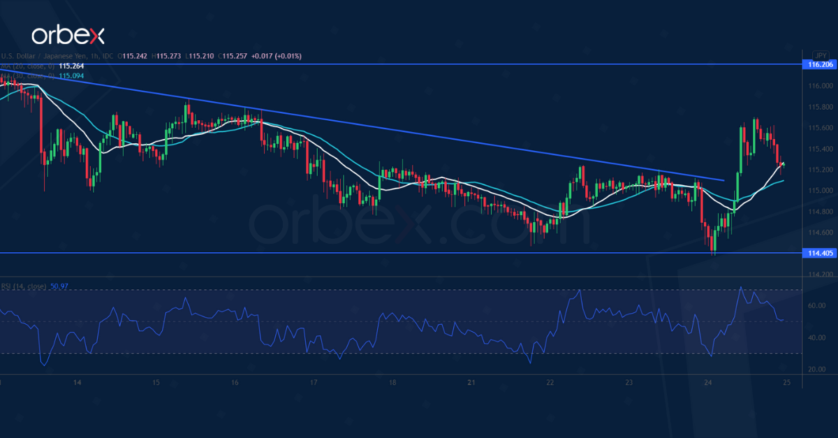 Strong momentum above the trend line and 115.20 forced sellers out of the game and would attract more purchasing power. A close above 116.20 would extend the rally towards 117.00.