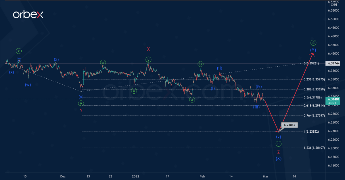 At the time of writing, we are in the final part of the intermediate intervening wave (X). Only the second half of this wave is visible on the 1H timeframe chart. Most likely, wave (X) takes the form of a triple zigzag W-X-Y-X-Z.