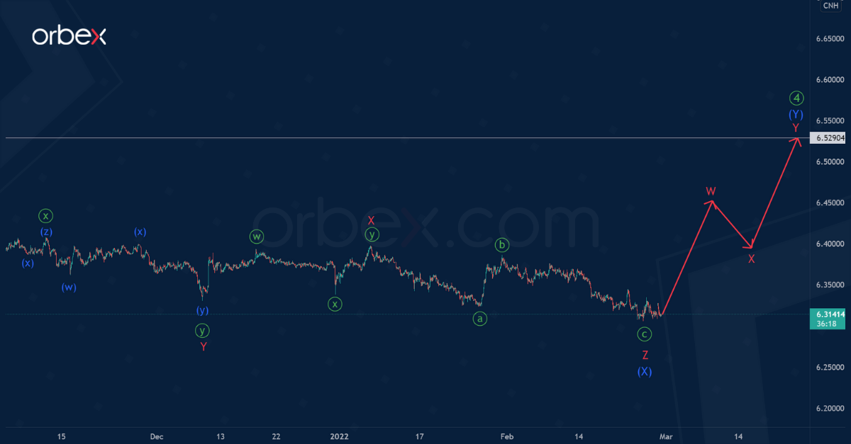 The USDCNH pair could be forming a large horizontal correction wave ④ of the primary degree. This takes the form of an intermediate double three (W)-(X)-(Y).