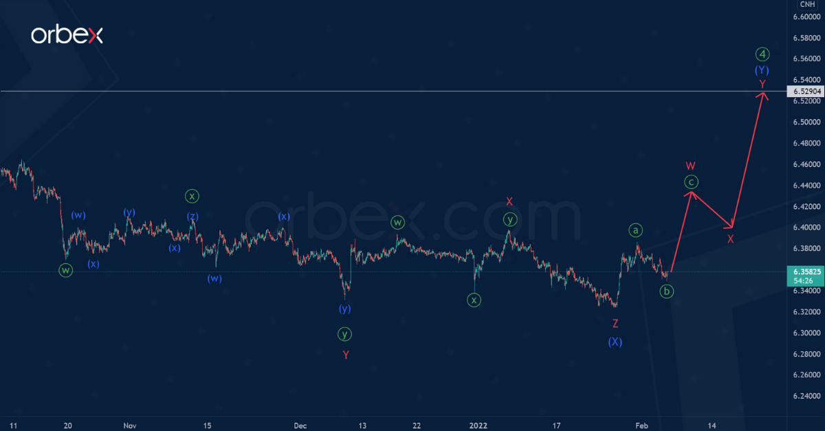 The USDCNH currency pair seems to be forming a large horizontal correction wave ④ of the primary degree. This takes the form of an intermediate double three (W)-(X)-(Y).