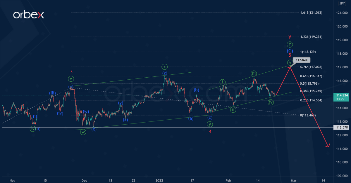 The USDJPY currency pair hints at the final section of the global actionary wave y of the cycle degree. This took the form of a primary double zigzag Ⓦ-Ⓧ-Ⓨ, where the last sub-wave Ⓨ is an intermediate zigzag (A)-(B)-(C).