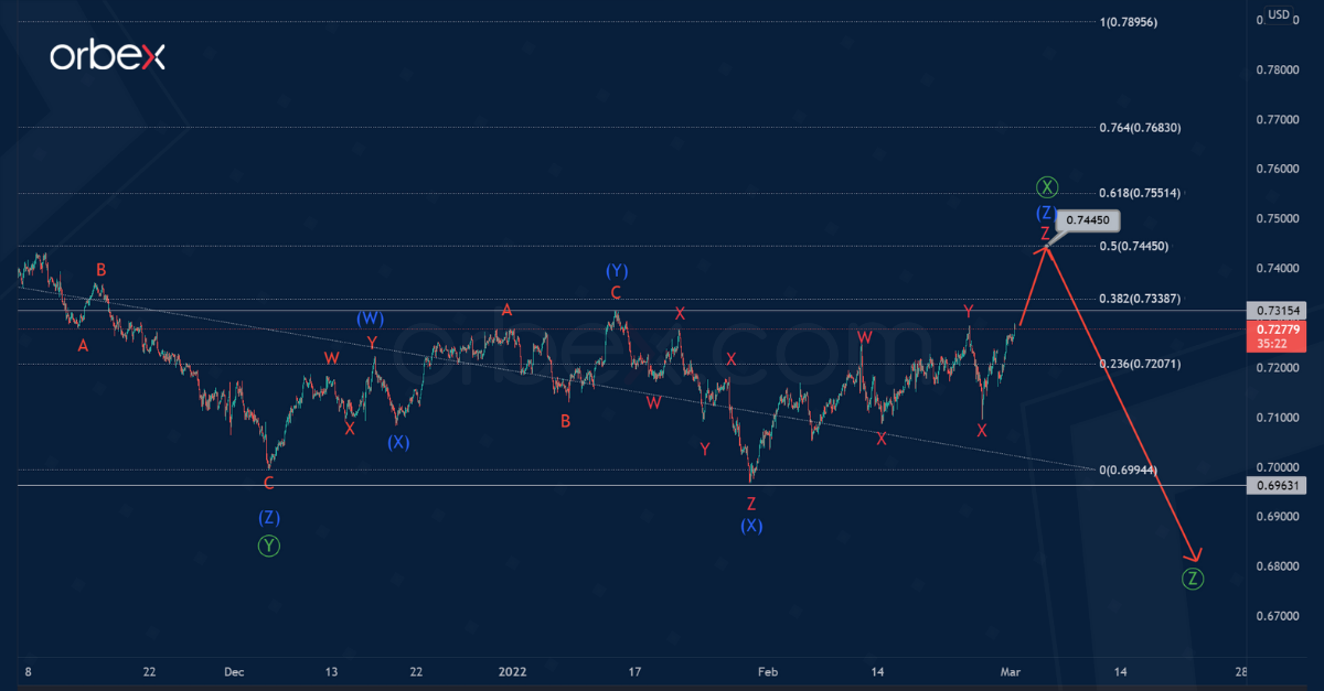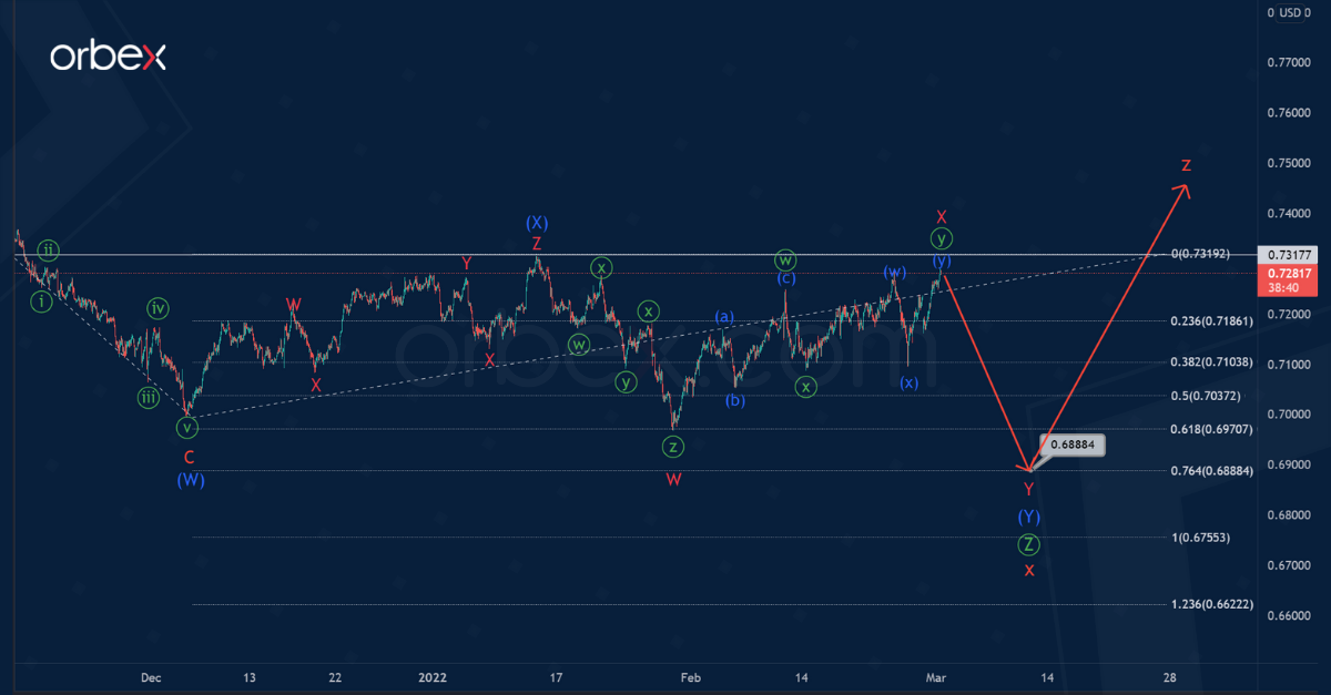 AUDUSD seems to be forming a bearish triple Ⓦ-Ⓧ-Ⓨ-Ⓧ-Ⓩ zigzag.
