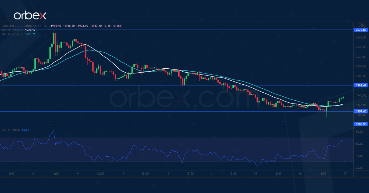 The price is testing the origin of the bullish breakout at 1907 which coincides with the 30-day moving average. An oversold RSI attracted some buying interest.