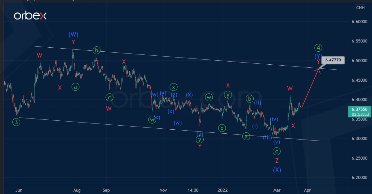 The USDCNH pair consists of primary sub-waves ①-②-③-④-⑤. In the long term, a large bearish impulse could be expected to be built.