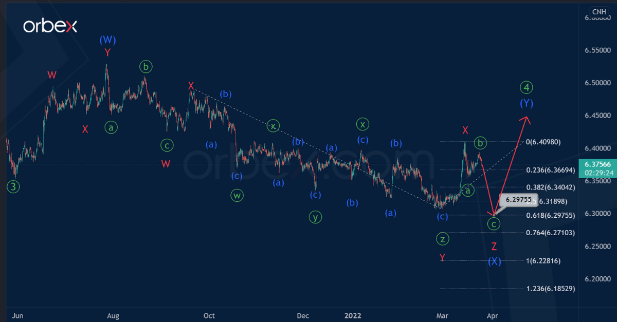 On the current chart, we see the final section of the bearish impulse ③. After this is a complex correction movement that began within the primary wave ④. This wave seems to take the form of a double three (W)-(X)-(Y) of the intermediate degree.