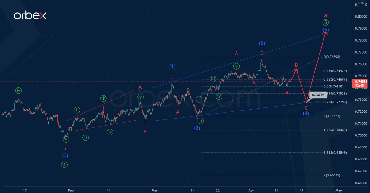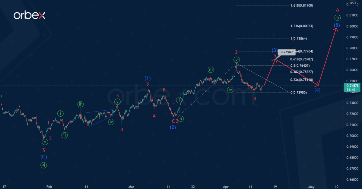 Thus, a correction wave (4) of the intermediate degree is currently under construction. It is likely that wave (4) will end at 0.727, forming a bearish zigzag A-B-C.