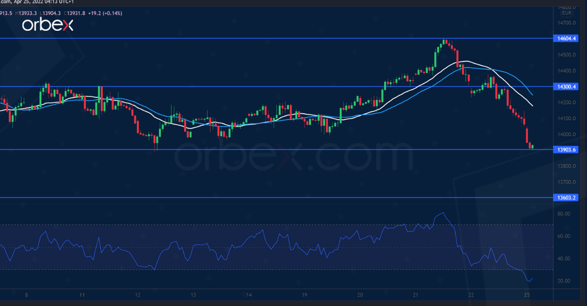 An overbought RSI led intraday traders to take some chips off the table. 13900 is a major demand zone at the base of a recent consolidation. Its breach would trigger a deeper correction towards 13600.