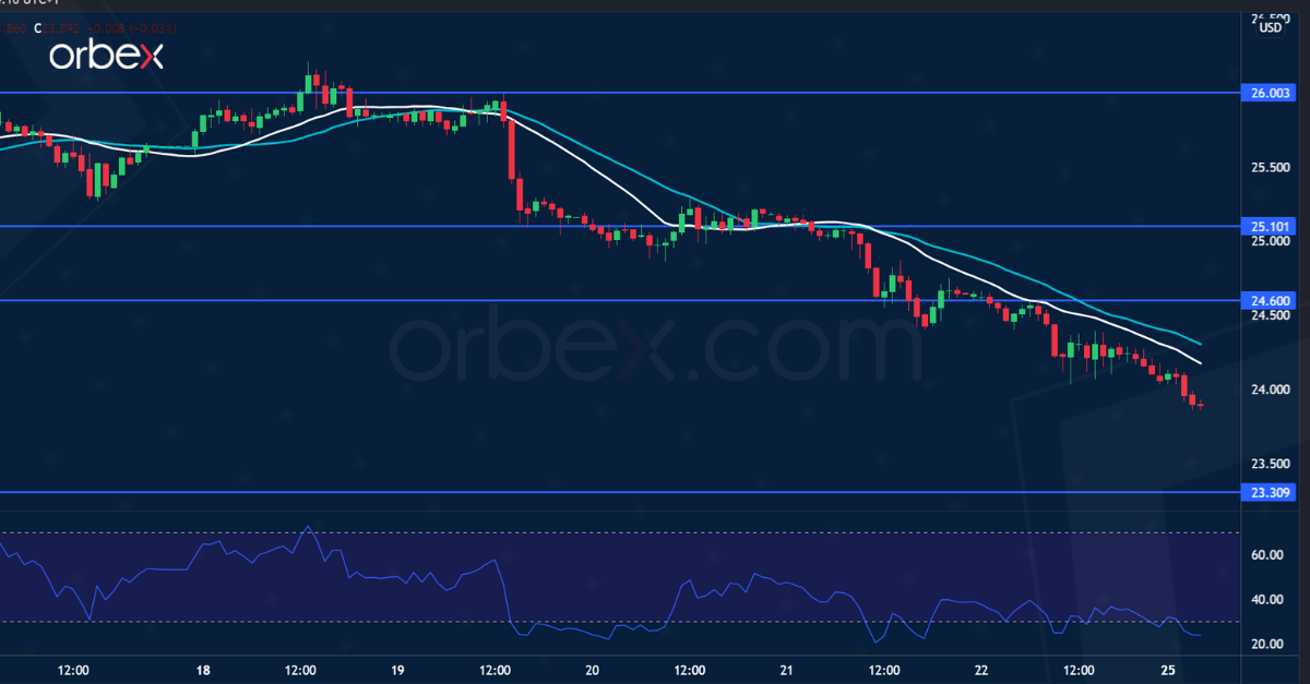 Silver slipped as the US dollar strengthened across the board amid rising Treasury yields. The precious metal has given up all gains from the rebound earlier this month, which reveals a lack of buying interest.