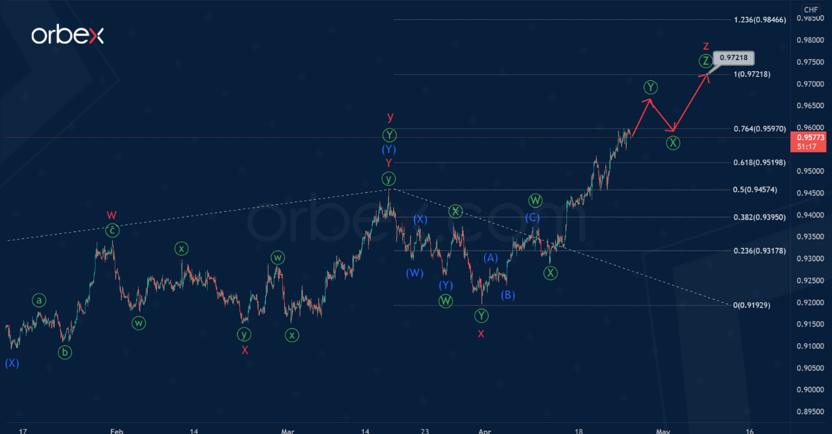 It is likely that in the upcoming trading weeks, the price will creep up in the primary sub-waves Ⓨ-Ⓧ-Ⓩ, as shown on the chart. Quotes can rise to 0.972. At that level, cycle waves z and y will be equal.