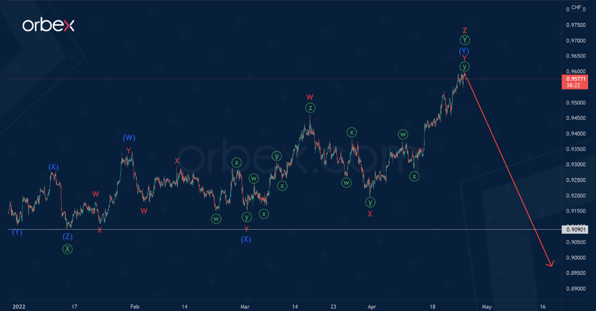 The current USDCHF structure suggests that the cycle wave y is fully complete, followed by a cycle intervening wave x.