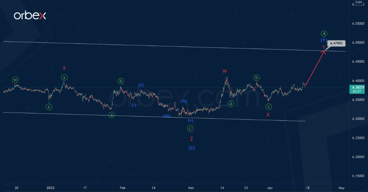 USDCNH suggests the construction of a large bearish impulse that consists of primary sub-waves ①-②-③-④-⑤.