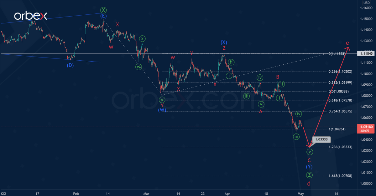 At the time of writing, a bearish wave d is developing, which is a complex triple combination Ⓦ-Ⓧ-Ⓨ-Ⓧ-Ⓩ. The current chart shows the internal structure of the last primary wave Ⓩ.