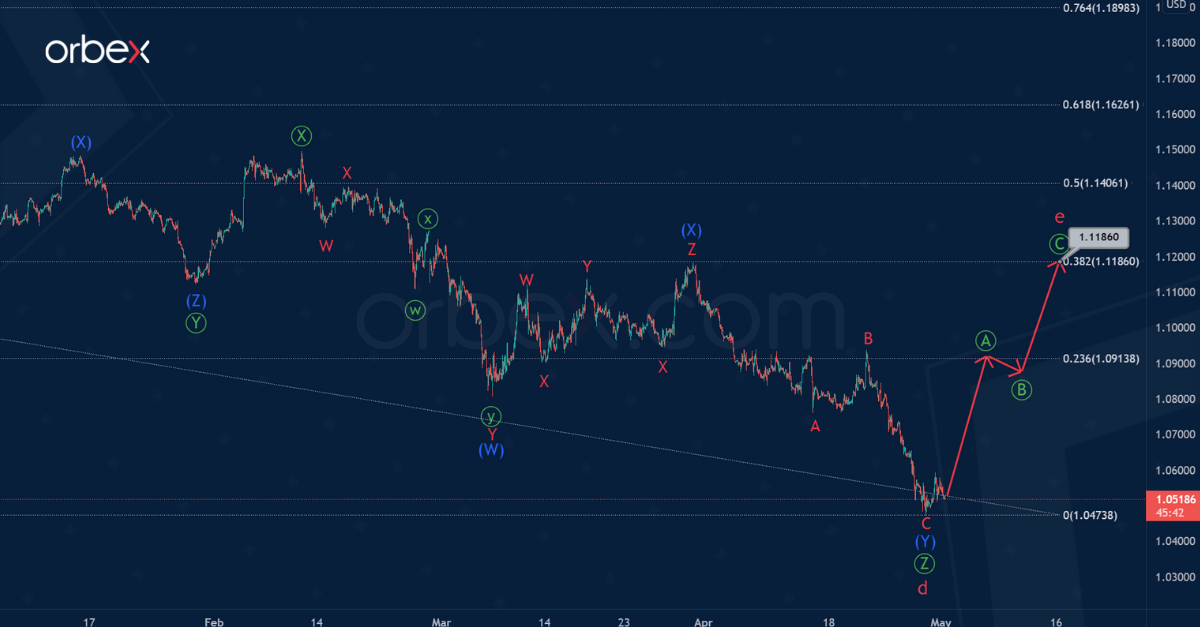Alternatively, the construction of a bearish triple zigzag of the primary degree can be fully complete. The entire correction d has also come to an end.