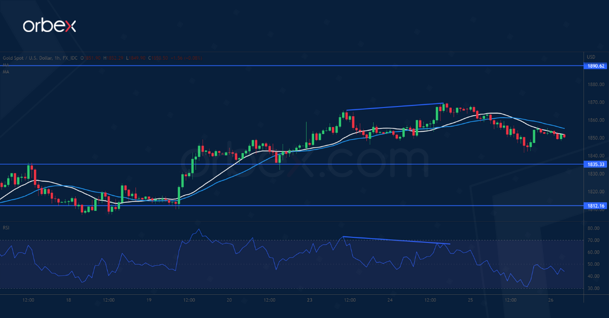 Gold consolidates recent gains as Fed minutes come out in line with expectations. The price continues to recover after it found support near last January’s lows (1790). A break above 1857 has prompted the bears to take some chips off the table. It would be too soon to call a bullish reversal though. A bearish RSI divergence indicates exhaustion in the current rally. 1835 is the immediate support and a pullback will be a test of the underlying strength. A successful rebound may send the precious metal to 1890.