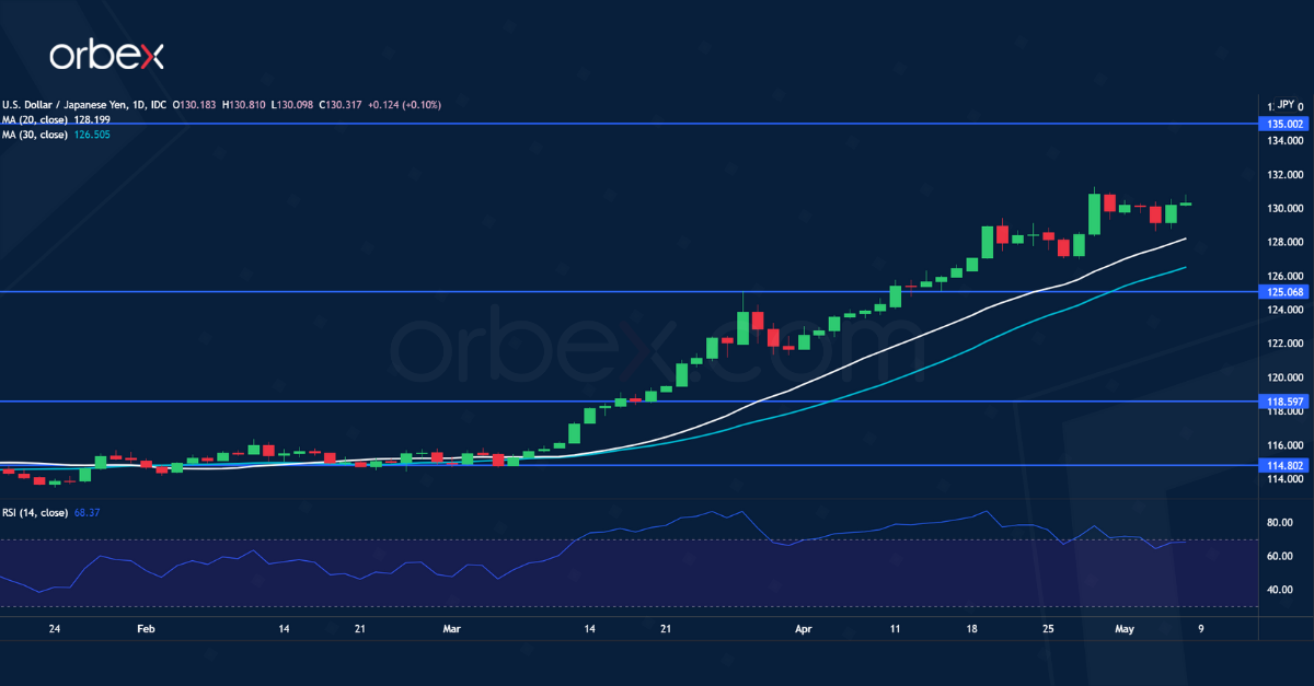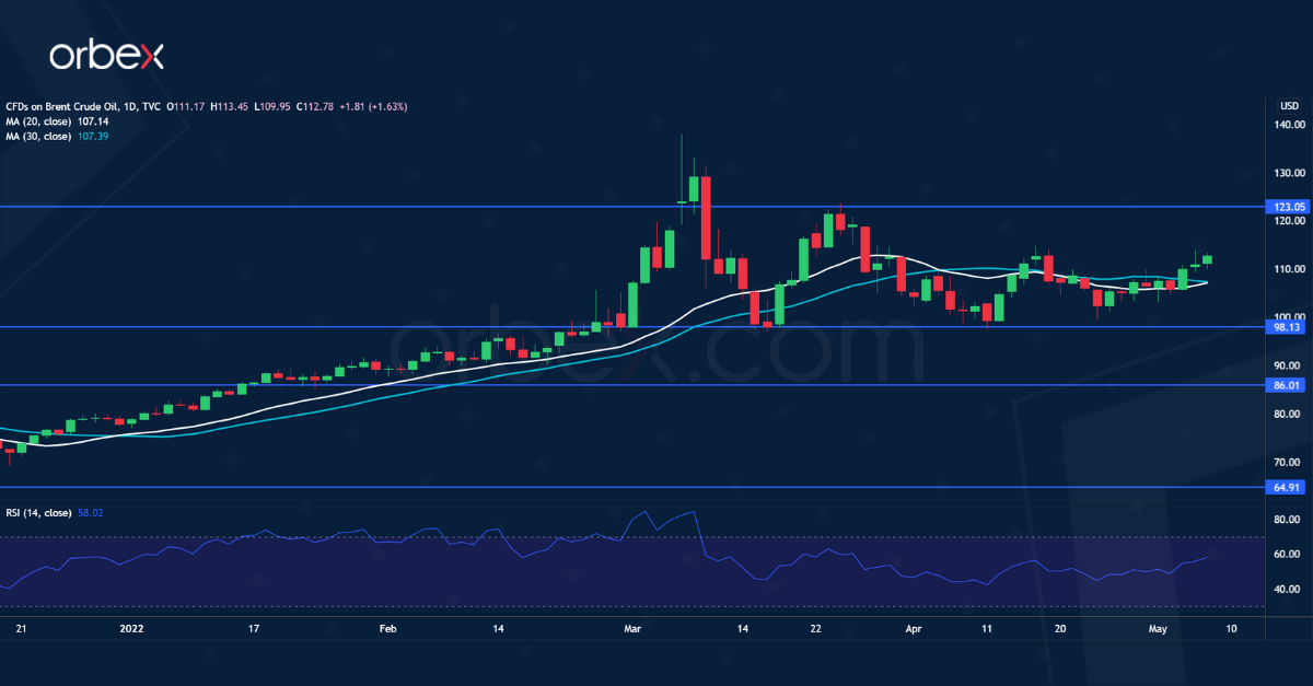Brent crude rallies on a potential EU embargo on Russian oil. The price action has been well-supported by tightening supplies lately. In a historic move, the European Commission proposed to phase out imports of Russian oil products by the end of 2022. Meanwhile, OPEC+ continues to ignore major consumers’ calls to raise their output, exacerbating the sense of scarcity. Headwinds may come from worries that lockdowns in China could cripple the demand. However, the uptrend indicates that geopolitics-driven supply issues still outweigh demand concerns. 98.00 is a key support and a break above 123.00 would lead to 138.00.