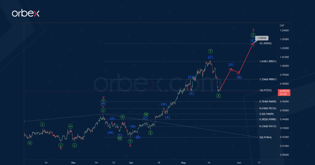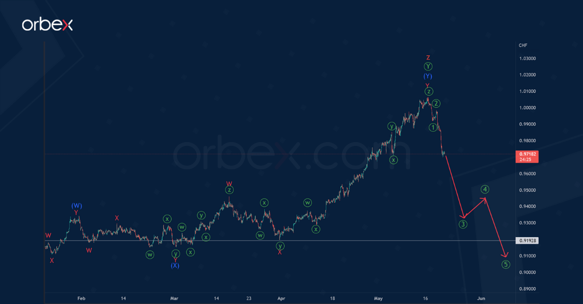 The USDCHF chart shows the final part of a large triple zigzag consisting of cycle sub-waves w-x-y-x-z.
