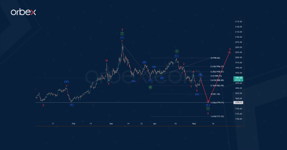 Gold in the intermediate impulse wave (C) in the upcoming days could fall to 1779.71. At that level, primary wave Ⓨ will be at 123.6% of primary wave Ⓦ.