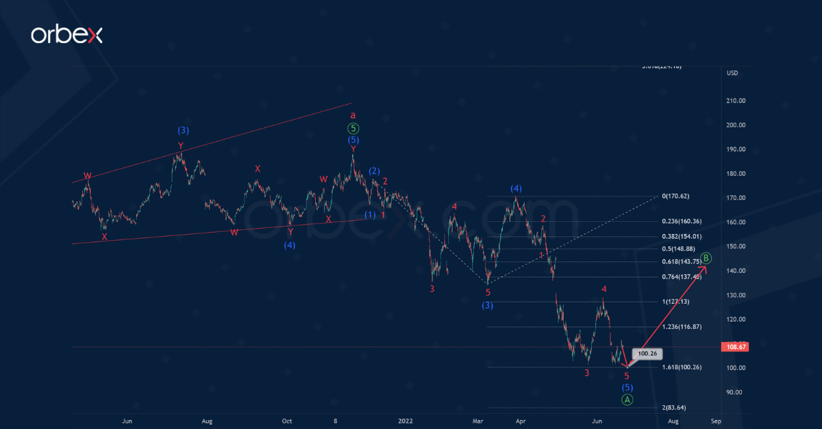 AMZN shares are forming a zigzag consisting of sub-waves a-b-c of the cycle degree. The first major wave a is a bullish 5-wave impulse.