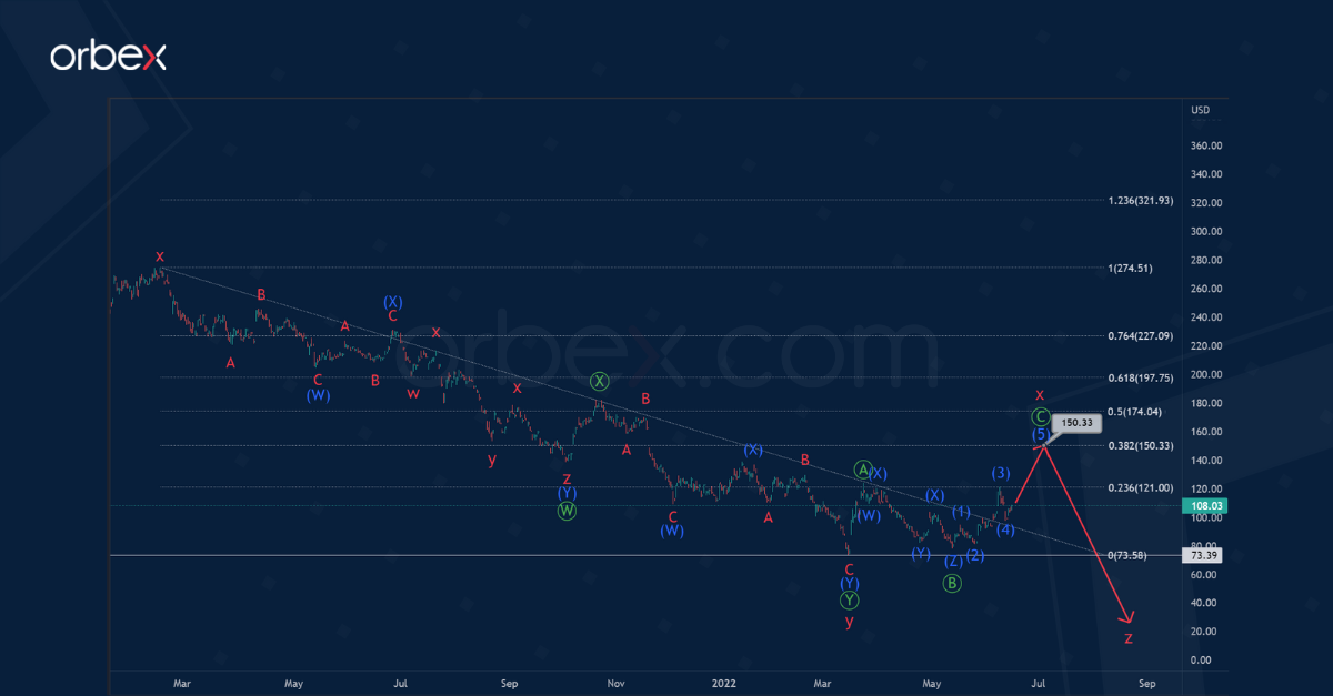 At that level, wave x will be at 38.2% of wave y. After the full completion of the cycle wave x, wave z could begin to decline below 73.39.