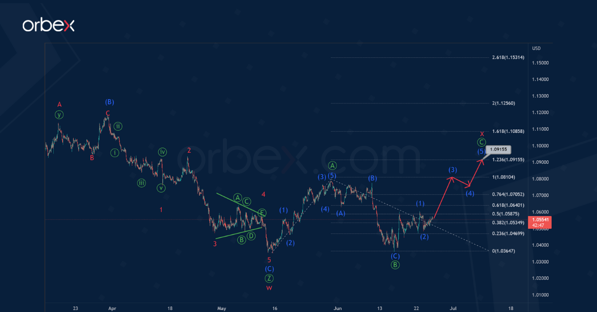 It is likely that in mid-May, the construction of the actionary wave w ended. This wave took the form of a primary triple zigzag Ⓦ-Ⓧ-Ⓨ-Ⓧ-Ⓩ. Then prices moved higher in the reactionary intervening wave x. Most likely, this wave takes the form of a primary zigzag Ⓐ-Ⓑ-Ⓒ.