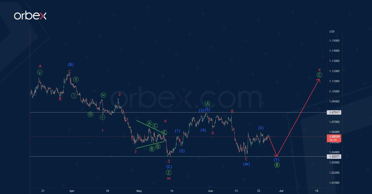 In the long term, EURUSD shows the formation of a bearish corrective trend. This could take the form of a double zigzag consisting of cycle waves w-x-y.