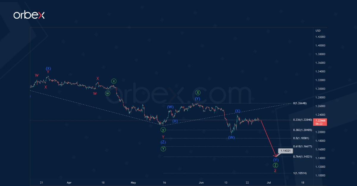 It is likely that in the near future the bearish trend will continue to develop in the primary wave Ⓩ. This could complete its intermediate double zigzag pattern (W)-(X)-(Y) near the 1.143 area.