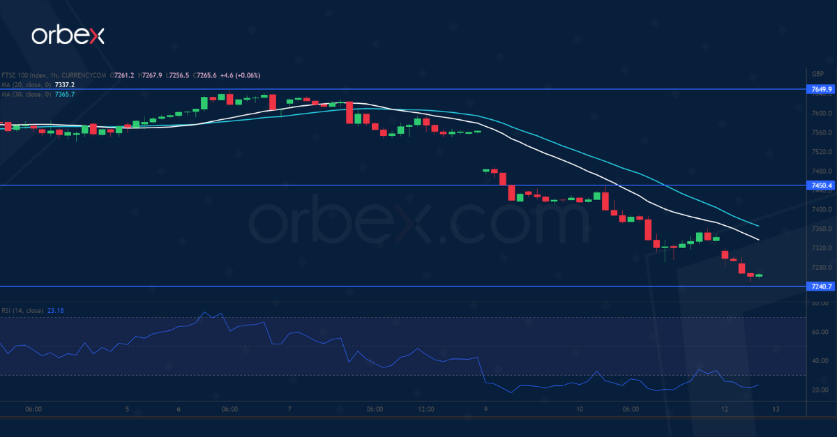The FTSE 100 tumbles as risk appetite recedes amid growth concerns. On the daily chart, the index has met stiff selling pressure at the double top (7650). A fall below 7520 has triggered a round of liquidation which suggests a lack of commitment from the buy side. 7240 is the next support as the RSI sank into the oversold area. Further down, the daily support at 7160 is a critical floor to keep the index afloat. A bearish breakout could trigger a sell-off towards 7000. 7450 is the closest resistance in case of a rebound.