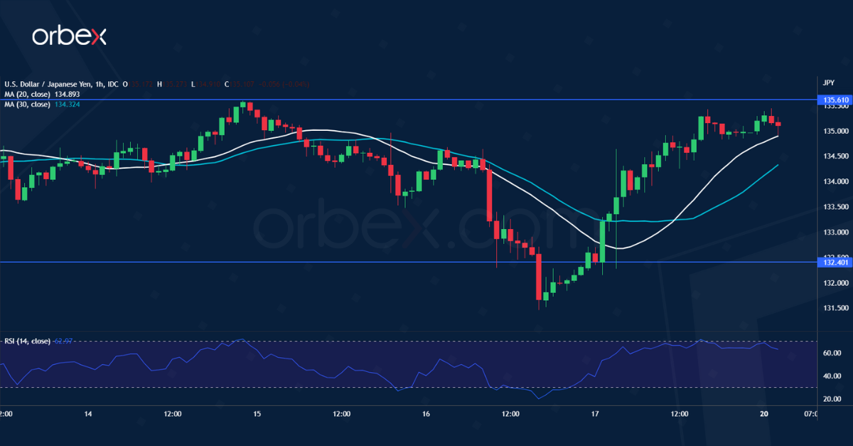 The Japanese yen fell back after the Bank of Japan vowed to keep interest rates ultra-low. A sharp U-turn above 134.50 has taken sellers by surprise and forced them to cover. A bullish MA cross suggests a possible acceleration to the upside. The recent peak at 135.60 is a key resistance and its breach could resume the rally towards 137.00. As the RSI goes into the overbought area, momentum buying could be fading as intraday traders take profit. The base of the latest surge at 132.40 would be the first support.