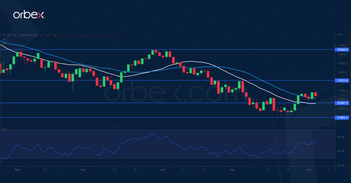 The Nasdaq 100 inches higher as risk sentiment improves. The index saw a brief pause following a Fed official’s hawkish comment that half percentage point increases are needed at every meeting until inflation is subdued. While relaxed Covid-19 curbs in China may brighten up the mood, investors may shift their focus on another risk event. Russia’s failure to pay $1.9 million in interest raised concerns of its first default on external debt in over a century. There is definitely too much on investors’ minds for another V-shaped recovery. The index is heading to the resistance at 13550. 12300 is the immediate support.