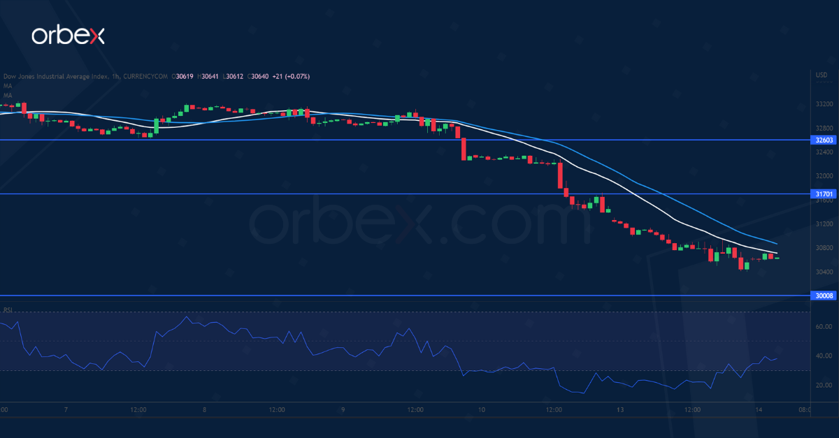 The Dow Jones plunges over a broad-based rise in risk aversion. The liquidation continued after the price action failed to hold above 32600. Sentiment remains overwhelmingly downbeat. A fall below the major support at 30700 may officially make the recent rally a dead cat bounce and send the index into bearish territory. The psychological level of 30000 would be the next support. An oversold RSI may trigger a temporary bounce but the bears could be expected to sell into strength near 31700.